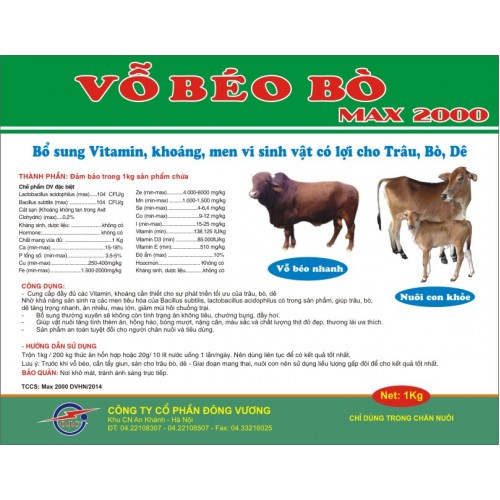 Việc bổ sung thêm sản phẩm “Vỗ béo bò – Max.2000” sẽ cung cấp đầy đủ các loại vitamin và khoáng chất thiết yếu cho sự sinh trưởng phát triển của bò cũng như nâng cao phẩm chất thịt (tăng độ nạc, tạo mầu thịt đẹp), ngoài ra việc bổ sung đầy đủ và cân đối các yếu tố vi lượng sẽ làm tăng tính ngon miệng khi ăn, hạn chế các dịch bệnh về da, lông, móng... do thiếu chất gây nên.